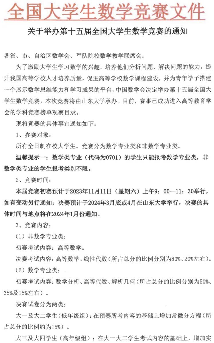 為了激勵(lì)大學(xué)生學(xué)習(xí)數(shù)學(xué)的興趣, 培養(yǎng)他們分析問(wèn)題、解決問(wèn)題的能力, 提 升我國(guó)高等學(xué)校人才培養(yǎng)質(zhì)量, 促進(jìn)高等學(xué)校數(shù)學(xué)課程建設(shè), 并為青年學(xué)子搭建 一個(gè)展示數(shù)學(xué)思維能力和學(xué)習(xí)成果的平臺(tái), 中國(guó)數(shù)學(xué)會(huì)決定舉辦第十五屆全國(guó)大 學(xué)生數(shù)學(xué)競(jìng)賽, 本次競(jìng)賽將由山東大學(xué)承辦。目前, 賽事已成功進(jìn)入高等教育學(xué)會(huì)的學(xué)科競(jìng)賽榜單觀察目錄。