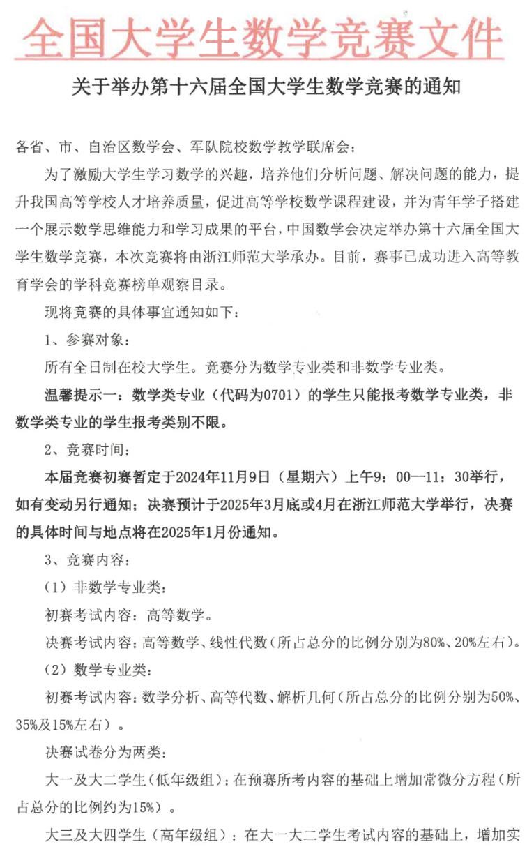 第十屆全國大學(xué)生數(shù)學(xué)競賽通知