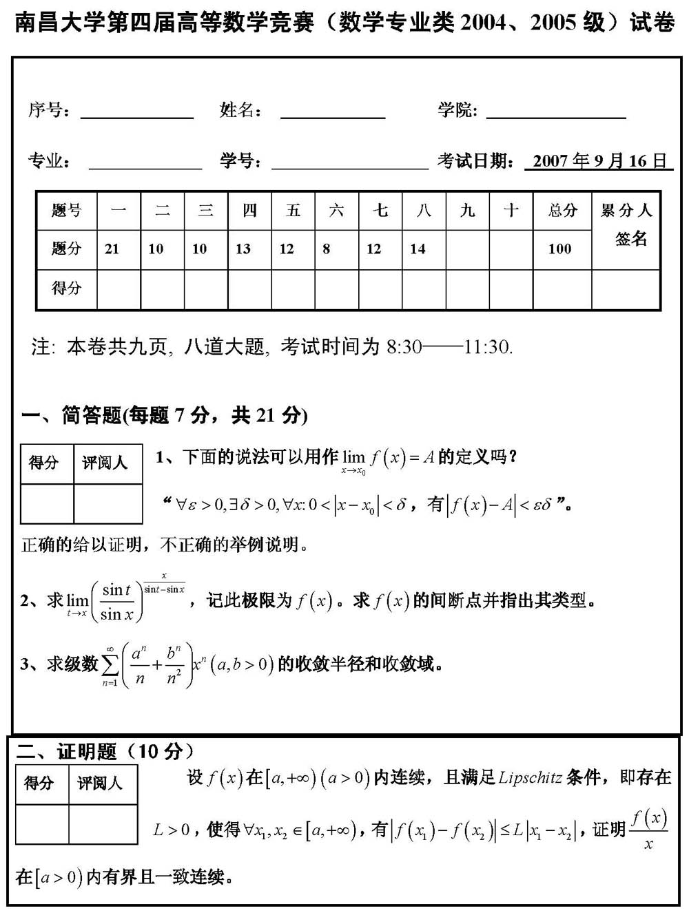 南昌大學(xué)第四屆高等數(shù)學(xué)競(jìng)賽(數(shù)學(xué)專(zhuān)業(yè)類(lèi)2004、2005級(jí))試卷