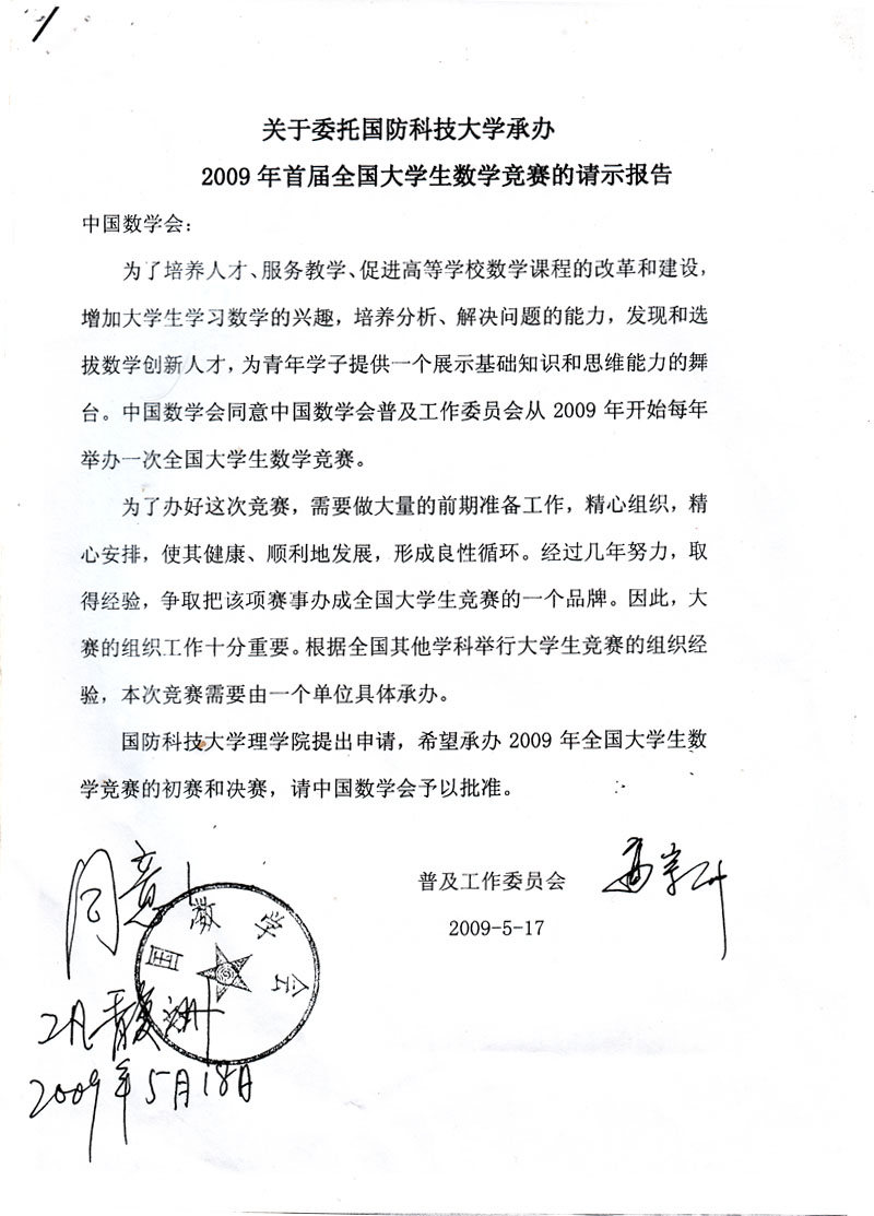 您當(dāng)前位置:網(wǎng)站首頁 >> 通知公告 >> 關(guān)于委托國防科技大學(xué)承辦2009年首屆全國大學(xué)生數(shù)學(xué)競賽的請示報告