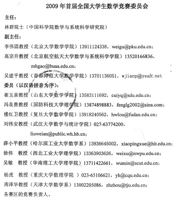 2009年全國(guó)大學(xué)生數(shù)學(xué)競(jìng)賽委員會(huì)組成及聯(lián)系方式