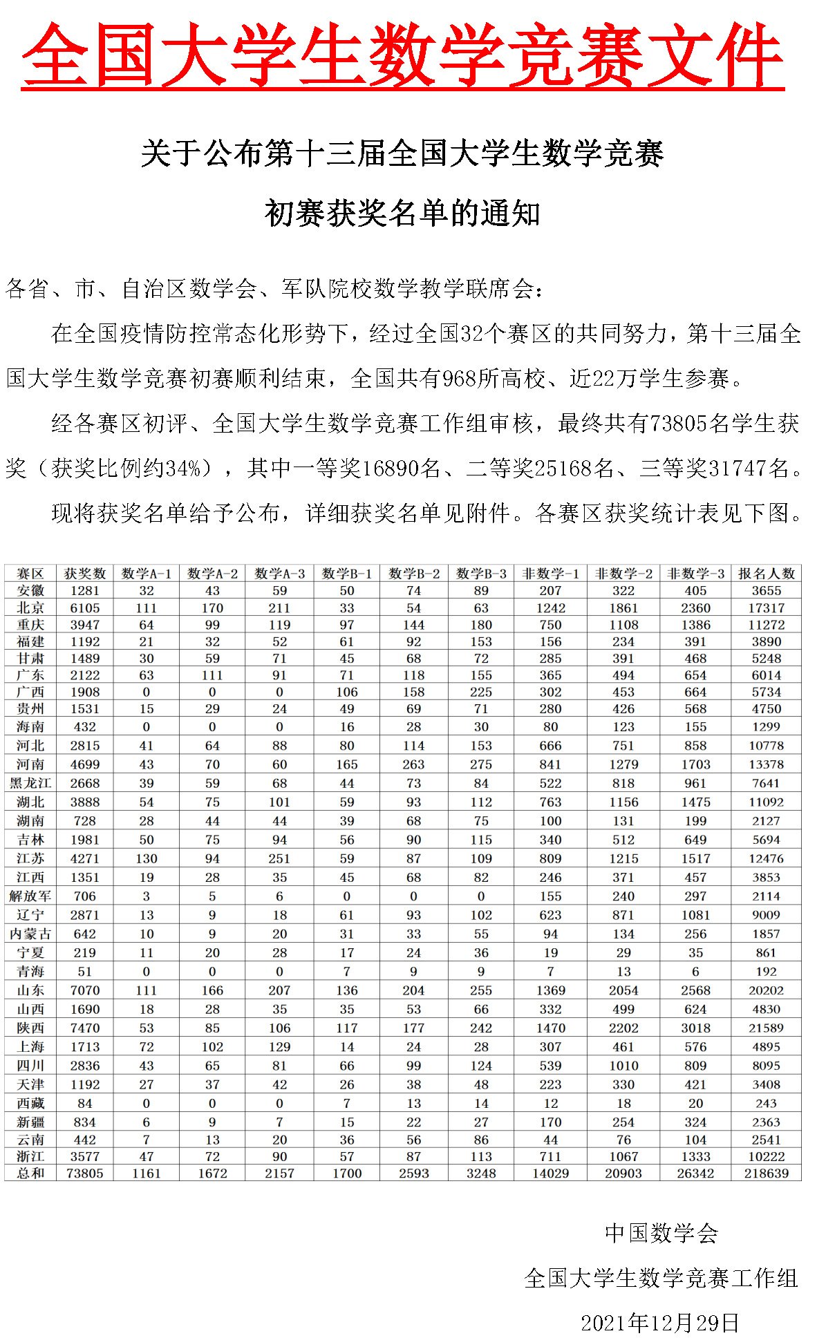 2021年第十三屆全國大學生數(shù)學競賽各賽區(qū)、省獲獎名單。