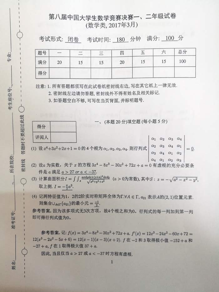 第八屆《數(shù)學(xué)類一、二年級》數(shù)學(xué)競賽決賽試題及參考答案