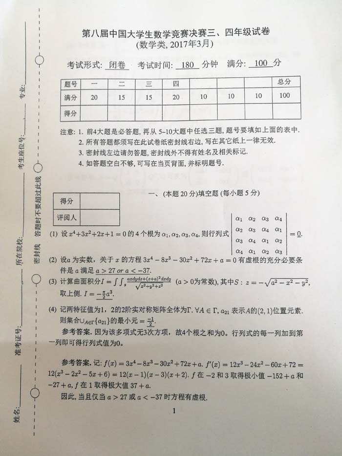 第八屆決賽-數(shù)學類三四年級試題及考答案2017-03-18 20:57:18 來源:中國大學生數(shù)學競賽網(wǎng)站內(nèi)容提要:第八屆《數(shù)學類三、四年級》數(shù)學競賽決賽試題及參考答案